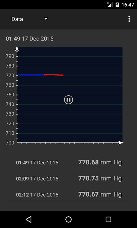 기압계 구현 위젯 (2 ×) 및 데이터 지정된 시간 간격을 저장하는 기능하십시오. 저장 및 대기압의 현재 데이터를 그래프로 표시됩니다.