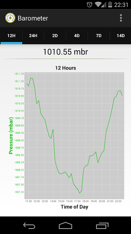 - Recorded pressure trend is presented in multiple charts (12 hours, 24 hours, 2 days, 4 days, 7 days, and 14 days)