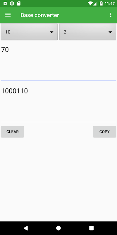 왼쪽에서 "from"베이스를 선택하고 오른쪽에서 "to"베이스를 선택하여베이스 사이를 변환 할 수 있습니다. 전화 번호를 입력하면 앱이 자동으로 전화 번호를 변환합니다.