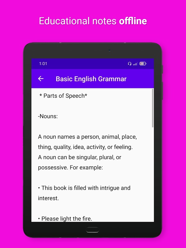 기본적인 영어 문법 학습에 유용한 이 안드로이드 애플리케이션에는 기본적인 문법 규칙, 문장 구조, 품사, 문장 구성도 포함되어 있습니다.