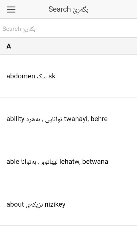 This app contains approximately 500 words divided into five categories: Alphabet, Adjectives, Adverbs, Pronouns, and Propositions. you can easily tap on any category to see the list of English and their relevant Kurdish meanings. You can also search the database using any keyword you type in the search box! Note that the Kurdish dialect used for this app is Kurdish Sorani (Central Kurdish).