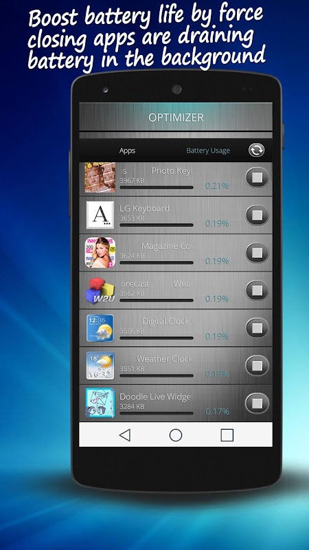 If you are into ''cool widgets'' then this optimizer app is the perfect solution to all your problems. This convenient ''battery saving'' app will spare you the stress and agony of losing ''battery power'' when you need it the most. You will never again ask yourself how to save your battery. With our latest widget app you will increase the functionality of your phone and tablet. Extend the battery usage time with this handy little batery saver smartphone app. Prevent battery draining fast with one of the most beautiful widgets pro. A simple widget is all you need to beautify your phone. You can use this simple but powerful tool on any screen resolution and on both tablets and phones. We guarantee you will enjoy the beautiful features of this phone optimizer. Beautiful widgets are the latest trend in phone personalization and an absolute must for any trend follower. Download this smartphone app and see it for yourself!