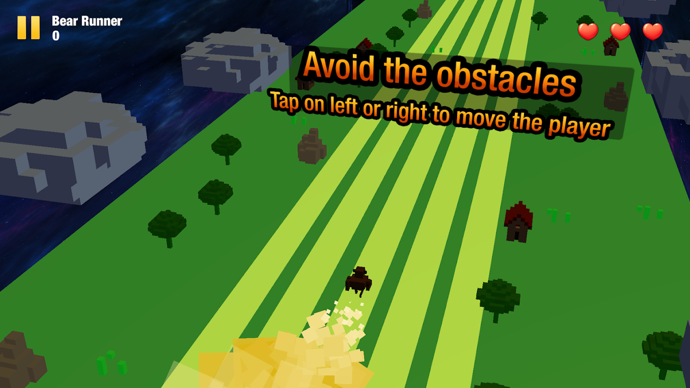 Bear runner is a fantastic game with texture graphics. It is a simple game at the same time very challenging. Run on a five-way lane surrounded by an other worldly environment and a mysterious horizon. But that’s not all, somebody put rocks on the lane and you have to avoid crashing on them when you are running wild.