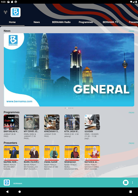 BERNAMA Radio는 말레이시아 최초의 뉴스 및 정보 라디오 방송국입니다. Klang Valley의 BERNAMA 무선 주파수 93.9 FM | 107.5 FM | 쿠칭 100.9 FM 및 코타 키나발루 107.9 FM.