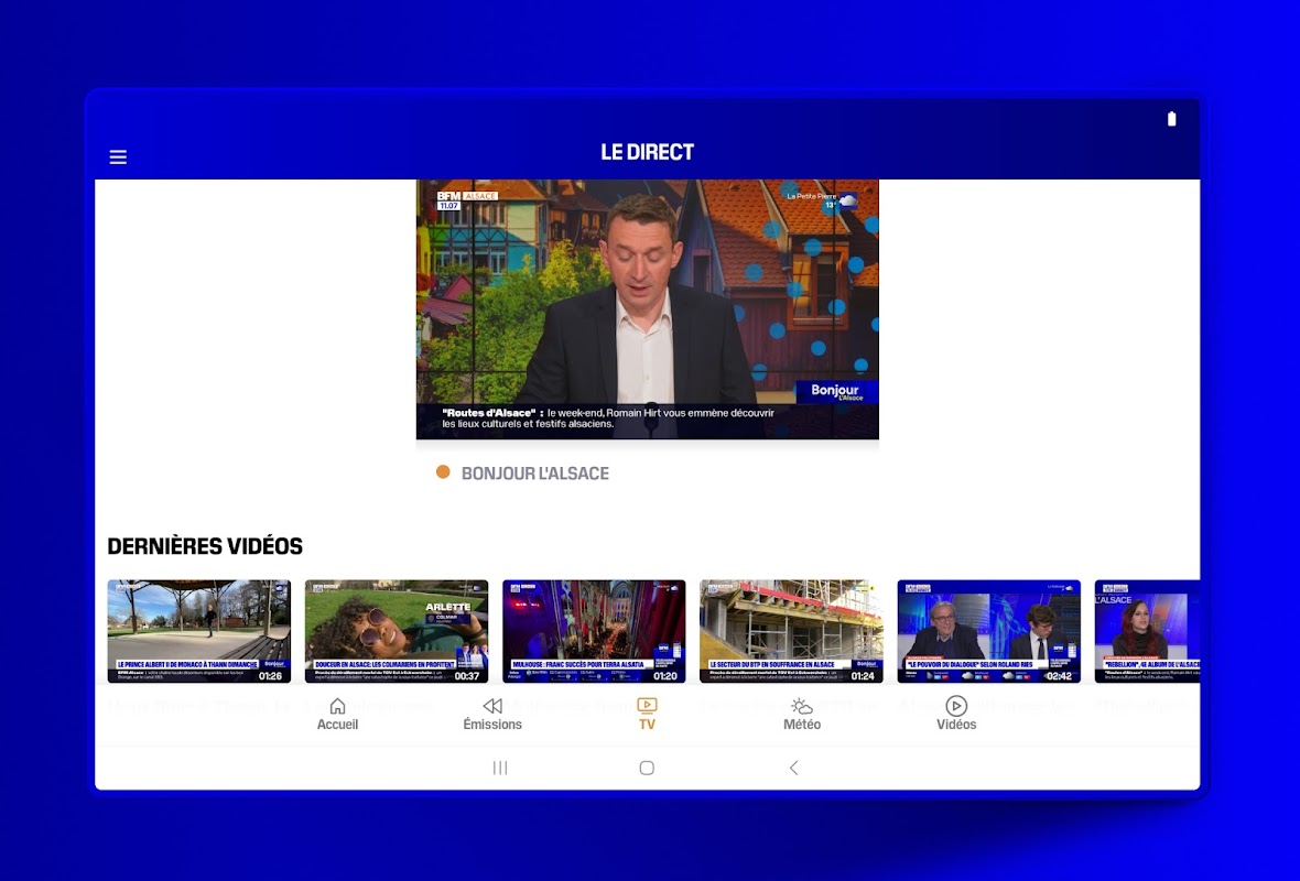 • “TV” 섹션에서 BFM 알자스의 생방송에 접속하여 해당 지역의 뉴스를 놓치지 마세요.