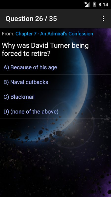 A pop quiz, allowing fans of the Battle for the Solar System space opera novel series to test their knowledge. Over 1,000 questions available for HONOUR OF THE KNIGHTS (First Edition), HONOUR OF THE KNIGHTS (Second Edition), THE THIRD SIDE, and THE ATTRIBUTE OF THE STRONG!