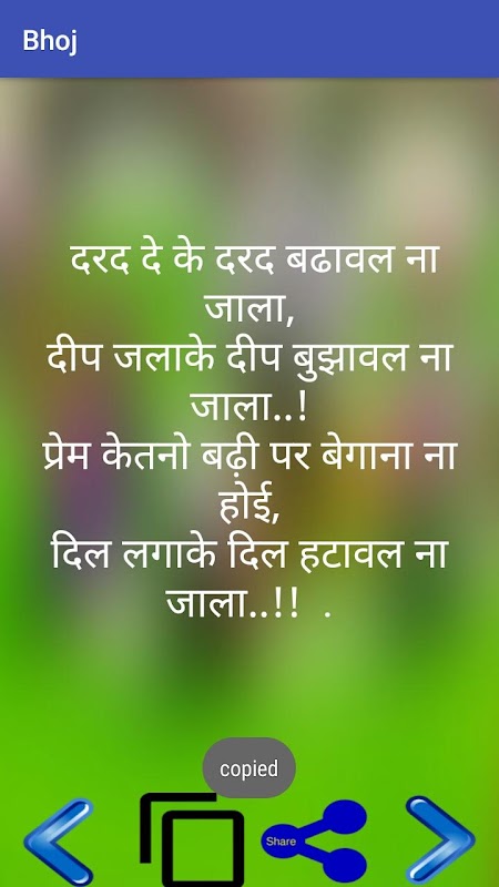 Bihari and Uttar Pradesh's People are alway searching for Bhojpuri video songs, Bhojpuri Shayari and other related with Bhojpuri on Interner using movile or Desktop. In this Application I am going to give you best Bhojpuri Shayari for free.