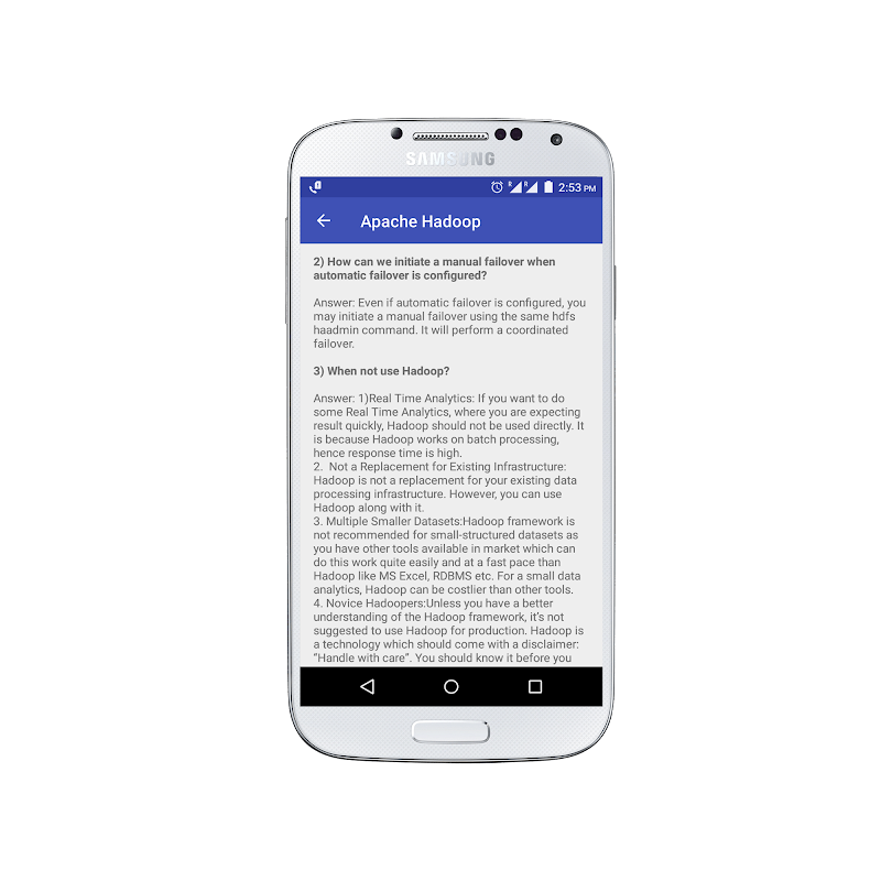 빅 데이터 하둡 인터뷰 질문 및 답변에 대한 최상의 정보를 제공합니다. 이 응용 프로그램은 기본에서 사전에 이르기까지 Hadoop을 배우기위한 수많은 실제 시나리오 질문이 포함되어 있습니다