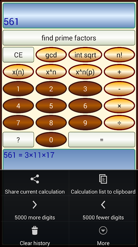 Prime factors of an integer can be calculated. For example, 2^67 - 1 can be found by finding 2^67, then subtracting 1. Pressing the prime factor button will then search for factors of this number (in the case of this number, "Cole's number", the Pollards Rho depth will have to be increased using the menu, but the app can find the two factors).
