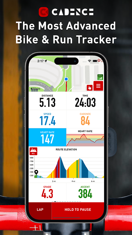 핸들바에 장착하거나 주머니에 넣어 휴대할 수 있는 Cadence는 운동 경로를 유지하고 중요한 정보를 기록합니다.