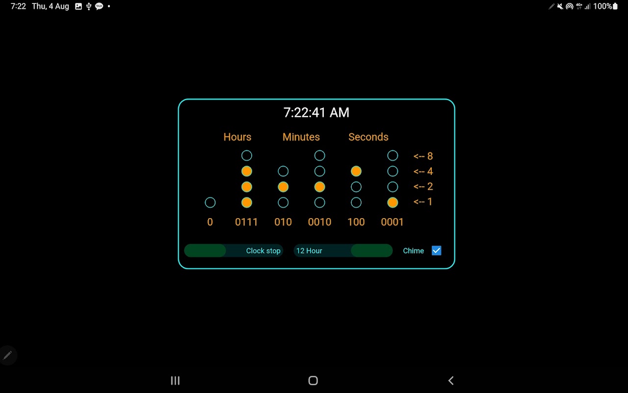 시계의 모든 2진법 숫자는 파란색으로 표시되며 "1"인 비트는 주황색, "0"인 비트는 검은색입니다.