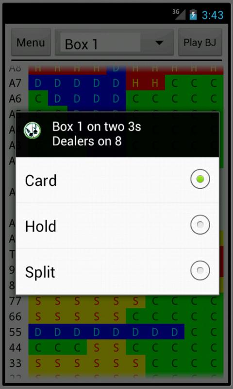 A blackjack table with six betting boxes. You or Android can play a box. How Android plays, bets, counts cards, etc. can be defined by you i.e. when to take a card, hold, split, double; or even whether to use counting when deciding size of bet, can be predefined by you.