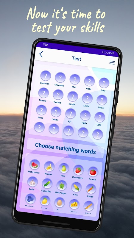 어휘에 익숙해지면 "test me"로 학습 진행 상황을 테스트하고 단어를 번역과 연결하세요.