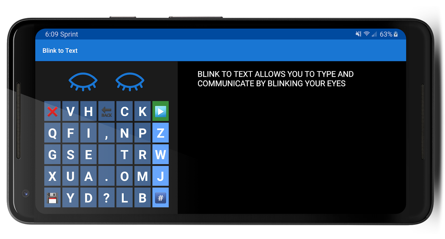 Blink to Text uses the Google Vision API to track eye movement every quarter of a second using your device's front facing camera. This app does not connect to the internet, and no user data is collected.