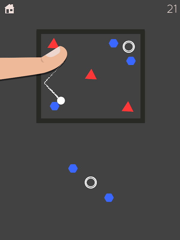 3. 그렇게하려면 메인 퍼즐 볼을 그 방향으로 움직이기 위해 손가락을 화면에 대고 선을 그리어야합니다. 그것은 물리 법칙에 따라 바 / 막힌자를 향해 움직이며 튀어 오를 것이며, 그 경로에 공 / 육각형을 떨어 뜨릴 것입니다.