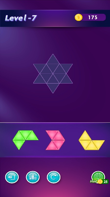 Blocks Triangle is a casual puzzle game that requires you to use your noggin! This is a puzzle game set against a blue and purple background with colorful tiles that you can drag to the white outline. Your objective is to completely fill up the white outline with the tiles available. Each level presents a new shape and challenge ready for you to solve. Some of them will have more complex outlines, tiles, and more pieces to place. There are 50 levels of puzzles for you to play and to figure out. While you do have to use your brain, this is still a calming game with no timer to stress you out. With every game, win coins that you can use to unlock hints to help you solve more difficult levels. Select the scoreboard icon to see where you rank against other Blocks Triangle players. Just pull out your phone or go to your computer to play this brainteaser game.