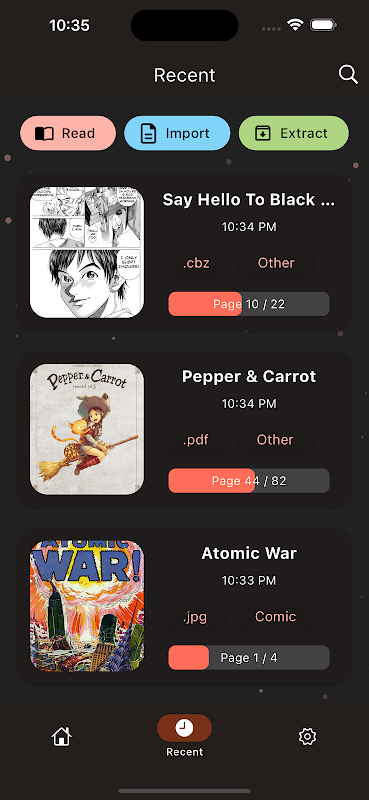 광범위한 파일 지원: bloopworm은 즐겨 사용하는 모든 이미지 형식(JPG, JPEG, PNG 및 WEBP)과 압축 파일(CBZ, CBR, RAR, ZIP 및 PDF)을 엽니다.