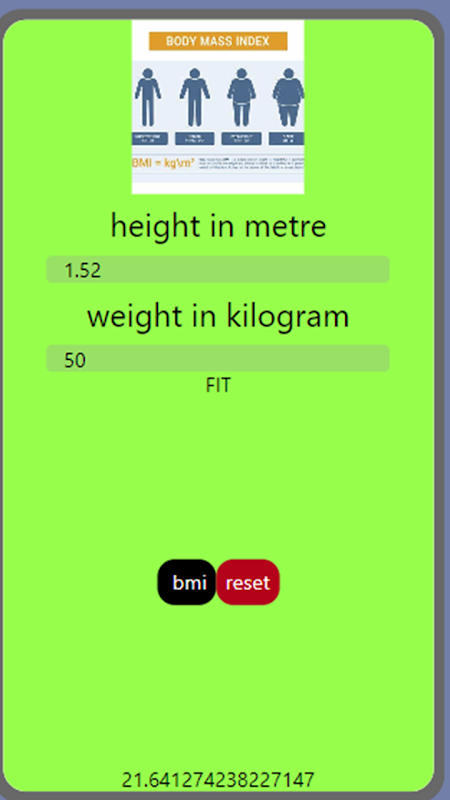 체질량 지수(BMI) 계산기 앱은 특정 사람의 BMI를 계산하고 찾는 데 더 많은 수작업 시간이 필요하지 않도록 프로그래밍된 소프트웨어입니다.