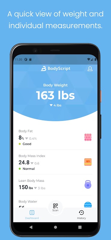 체중, 생체 및 개별 측정을 빠르게 볼 수있는 개인 대시 보드를 검토하십시오. 체지방 분석은 세 가지 체지방 유형, 즉 필수, 예비 및 초과 체지방의 체중을 보여줍니다. 각 측정에 대한 기록 및 개별 진행 상황을 사용할 수 있습니다.
