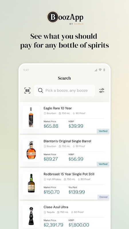 BAXUS의 BoozApp을 사용하면 지불해야 하는 가격(MSRP), 매장 및 2차 판매자가 지불하기를 원하는 가격(시장 가격), 대부분의 사람들이 옳다고 생각하는 가격(공정 가격)을 표시하여 스마트하게 쉽게 구매할 수 있습니다. 미국 시장의 모든 주류 한 병에 대해. BoozApp을 통해 주류 쇼핑을 100배 더 쉽게 만들어 보세요.