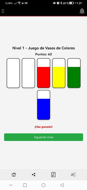 몇 개의 유리잔(정확히 말하면 시험관)이 있을 것입니다. 여러분의 임무는 같은 색의 액체를 맞추는 것입니다! 다른 유리잔이 비어 있거나 물의 최상층이 물을 가져오는 것과 동일한 색상인 경우에만 한 유리잔에서 다른 유리잔으로 다양한 색상의 물을 옮길 수 있습니다.