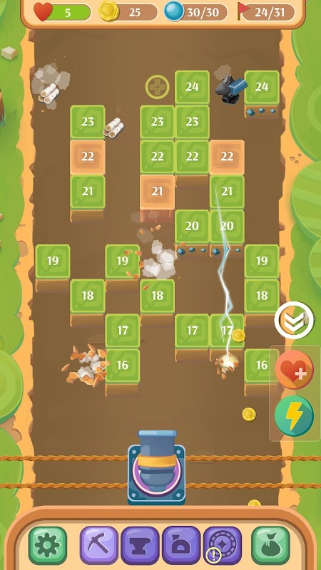 Explore randomly generated caves. Start the chain of bouncing balls as a pickaxe. Break as many blocks as possible, do not let the blocks destroy your gun. Find treasure chests. Extract resources: coal, wood, stone, gunpowder, rope, gunpowder, iron, gold, copper, diamonds, rubies and other ore. Use ore and stove to get new resources.