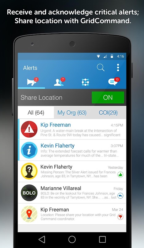 Receive critical alerts instantly from the BRIC and other commanders. Acknowledge received alerts with "Accept" or "Reject" status, or choose "Reply" to alert sender with additional input. Push notifications will let you know when a new alert is received. Read receipts let your coordinator know whether you've seen the alert. A backup email will let you know about an alert when you're away from your phone.