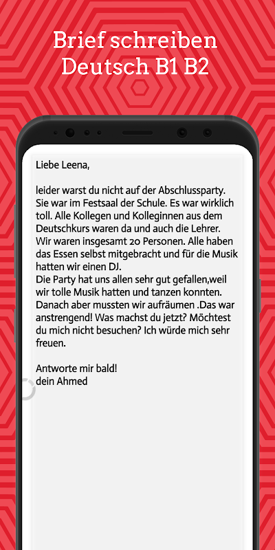 Diese App wird Ihnen bei der B2-Prüfung sehr helpen. Deutsch ist eine der logischsten Sprachen, diese App gibt Ihnen eine Gute Vorstellung davon, wie man Briefe schreibt. Wenn Sie Brief schreiben Deutsch a1, Brief schreiben Deutsch a2, Brief schreiben Deutsch b2 gelernt haben, wird Ihnen diese Anwendung sehr helfen.