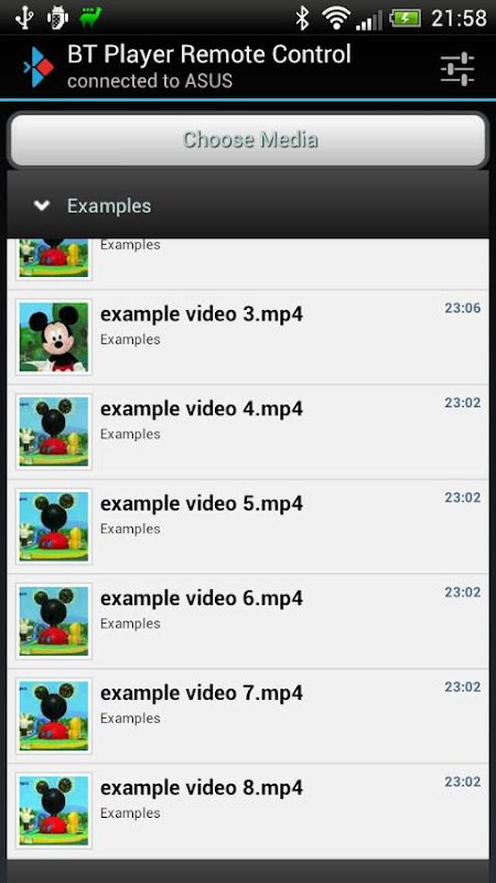 The application for playing videos. The player can be controlled with BT Player Remote Controller. The applications can be used for example in the car, where you can use one tablet like video player for your children and controls playing content with Remote Controller in your phone. For communication is used bluetooth.
