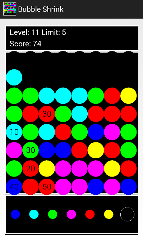The next touched Bubble will change the color to this and Bubbles will shrink when the count of neighboured Bubbles with the same color is greater or equal to the limit. Changing the color of a Bubble costs a scorepoint.