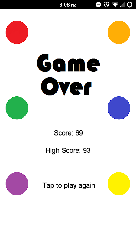 Bubble Sort is a simple game. By simple I mean EXTREMELY simple. Bubbles fall from the top of the screen. These bubbles are red, green, blue, purple, orange, or yellow. All you have to do is drag each bubble to the same colored circle. If a bubble reaches the bottom or you sort one into the wrong place, you lose. Simple as that.