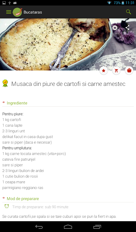 Aplicatia Bucataras iti permite sa porti cu tine lista de cumparaturi pentru reteta dorita, iar o alta facilitate este posibilitatea de a seta prin alarma telefonului timpi de gatire. Alegerea retetelor favorite si distribuirea prietenilor se face dintr-un singur click.