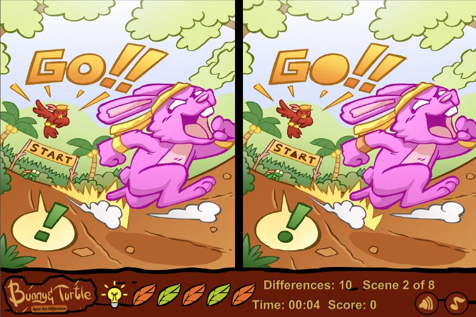 Spot and click all 10 differences between the scenes to progress through this funny bunny and turtle story Wrong clicks will cost you 5 points. If you get stuck, use the lamp to help you find it.