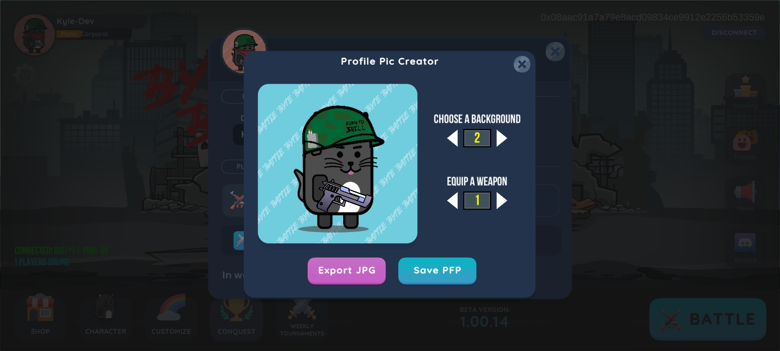Players are able to customize their character with cosmetics, i.e. helmets, hats, masks, glasses, etc. The cosmetics are a separate NFT collection, and each cosmetic has a limited supply of editions. The cosmetics are for in-game use, and they can also be used to customize character NFTs in the in-game PFP generator. The avenues for obtaining cosmetics outside of purchasing them from the in-game marketplace are still to be defined.