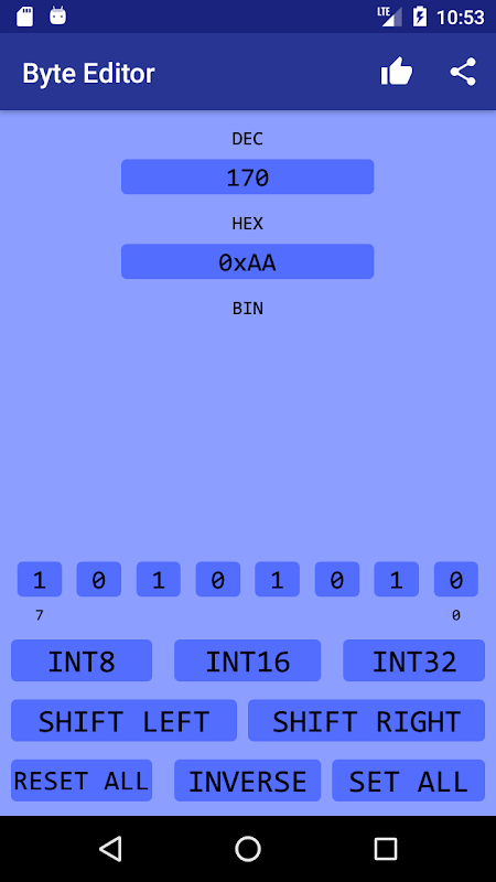 App allow easily generate required values of binary registers by changing each bit individually, simultaneously converting them to decimal and hexadecimal view.