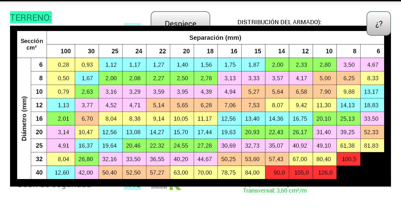 Al obtener también la relación m3 de hormigón por kg de acero nos permite comprobar rápidamente si un marco proyectado tiene un exceso (o defecto) de acero.