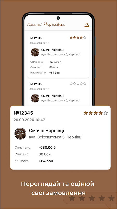 Tasty Chernivtsi 앱을 다운로드하면 고유한 로열티 프로그램의 일부가 됩니다.