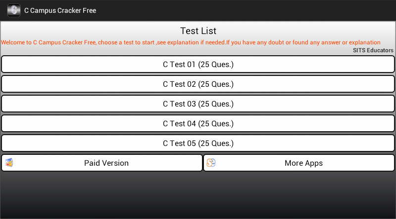 This app contain C test series ,choose a test and start answering ,see explanation , way & tricks to solve these questions.