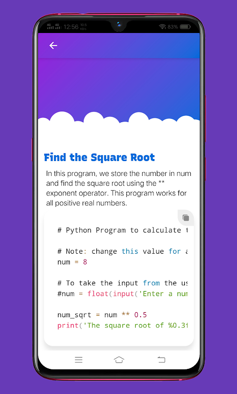This app is full of python programs, C++ Programs and java Examples. In addition to this, there is a lot of study stuff related to Java programming, C++ Programming and Python Programming as well.