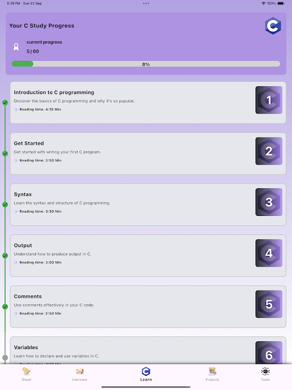 초보자를 위한 C 프로그래밍은 기본 구문부터 고급 개념까지 C 프로그래밍을 마스터하기 위한 완벽한 안내서입니다. 60개의 포괄적인 강의를 통해 이 앱은 코딩을 단계별로 안내하고 명확한 설명과 실제 코드 예제를 제공합니다.