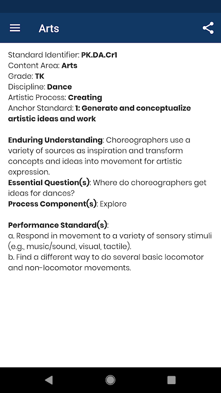 캘리포니아 교육자들은 모바일 앱을 사용하여 예술, 직업 기술 교육, 컴퓨터 과학, 영어 예술, 영어 개발, 건강 교육, 역사-사회 과학, 수학, 체육, 학교 도서관, 과학 및 세계 언어에 빠르게 액세스 할 수 있습니다. 학생들이 각 학년 수준에서 습득해야하는 지식, 개념 및 기술을 설계하기 위해 콘텐츠 표준에 의존합니다. 이 앱을 사용하여 표준을 검색, 필터링 및 정렬하여 특정 콘텐츠를 분리하고 여러 분야에서 공통적 인 표준을 식별하며 교육 및 평가에 관한 결정을 내릴 수 있습니다.