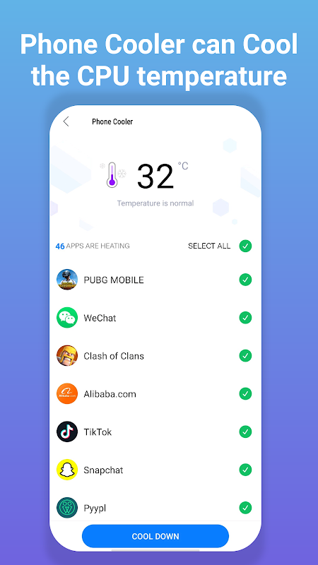 전화 온도. 휴대 전화를 뜨겁게 만들지 마십시오. Clean Master를 사용하면 온라인에서 즐거운 시간을 훨씬 더 오래 보내고 휴대전화도 더 오래 사용할 수 있습니다.