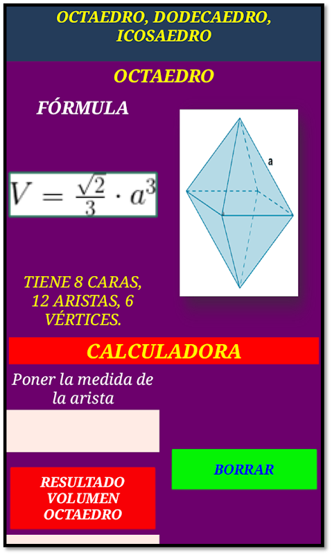 AYUDA A OBTENER EL RESULTADO DEL VOLUMEN DE: PRISMAS, PIRÁMIDES, ESFERA, CUBO, CILINDRO, CONO, OCTAEDRO, DODECAEDRO, ICOSAEDRO, CONO TRUNCADO. Cualquier comentario en cuanto a la mejora de la aplicación, favor de enviar correo electrónico a: [email protected]