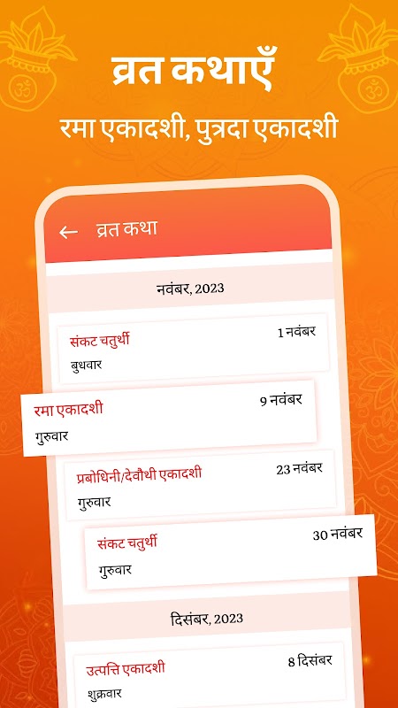 Ekadashi, Chathurthi, Poornima 및 Amavasya를 강조하는 월별 달력 보기입니다. 월별 축제 목록을 보여줍니다. 또한 각 날짜의 달의 위상을 표시합니다. 디왈리(Deepawali),