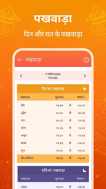 사용자는 일출, 일몰, 월출, 월몰, 티티, 나크샤트라, 요그, 카란, 길조, 불길한 타이밍의 일일 타이밍과 2024년 힌디어 판창이 포함된 2024년 달력의 월별 판창을 모두 포함하는 일일 판창의 전체 세부 정보를 볼 수 있습니다.