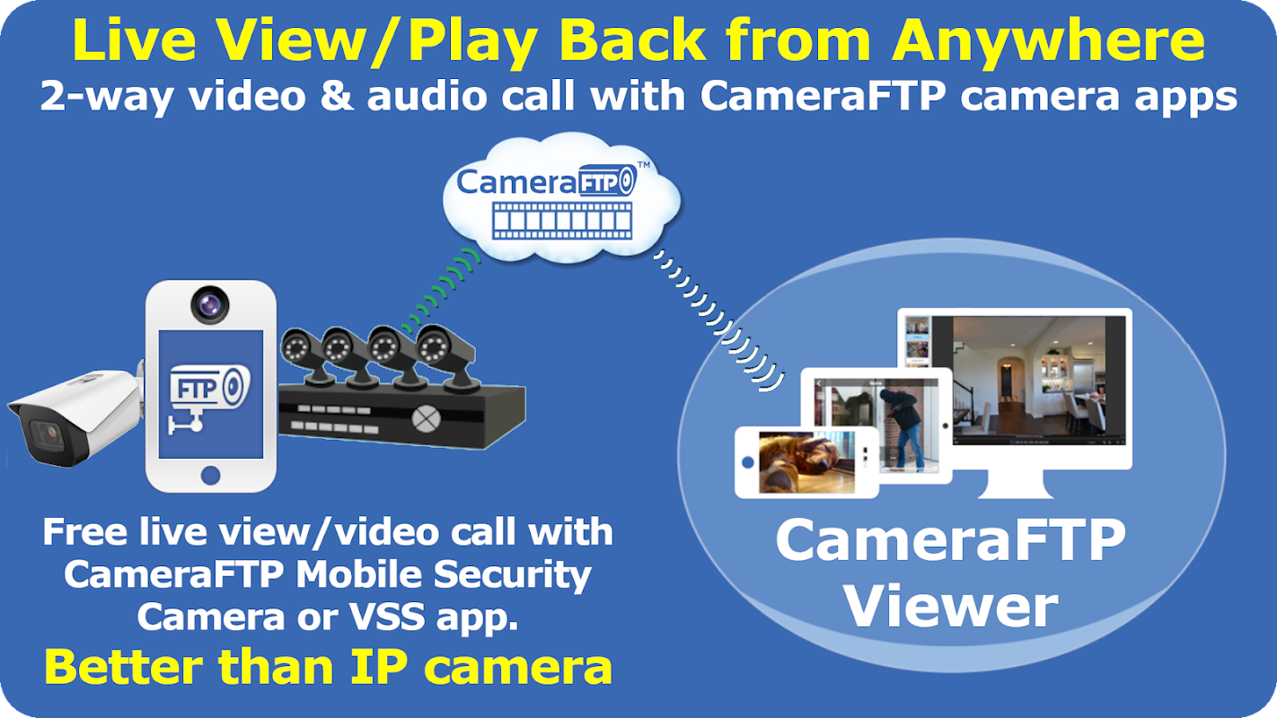 CameraFTP는 가정과 기업을 위한 혁신적인 보안 및 모니터링 서비스를 제공합니다. 월 $1.50부터 시작하여 기존 보안 서비스보다 훨씬 더 많고 더 나은 기능을 제공합니다. 설정이 매우 쉽고 대부분의 IP 카메라를 지원하며 웹캠이나 스마트폰 /태블릿을 보안 카메라로 사용할 수도 있습니다. 귀하의 영상은 침입자에 의해 파괴될 수 없는 CameraFTP의 보안 데이터 센터에 저장됩니다.