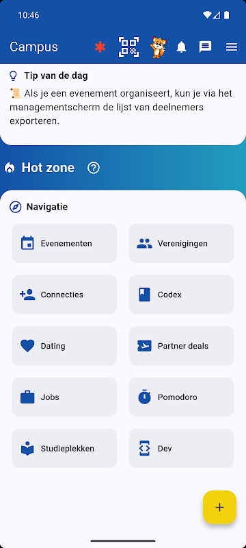 캠퍼스에는 (다른 기능들을 포함하여) 가입 가능한 동아리 및 행사, 학습 장소 개요, 그리고 디지털 학생 코덱스까지 포함되어 있습니다! 또한, 여러분의 행동과 위치에 따라 적합한 동아리를 추천해 줍니다.