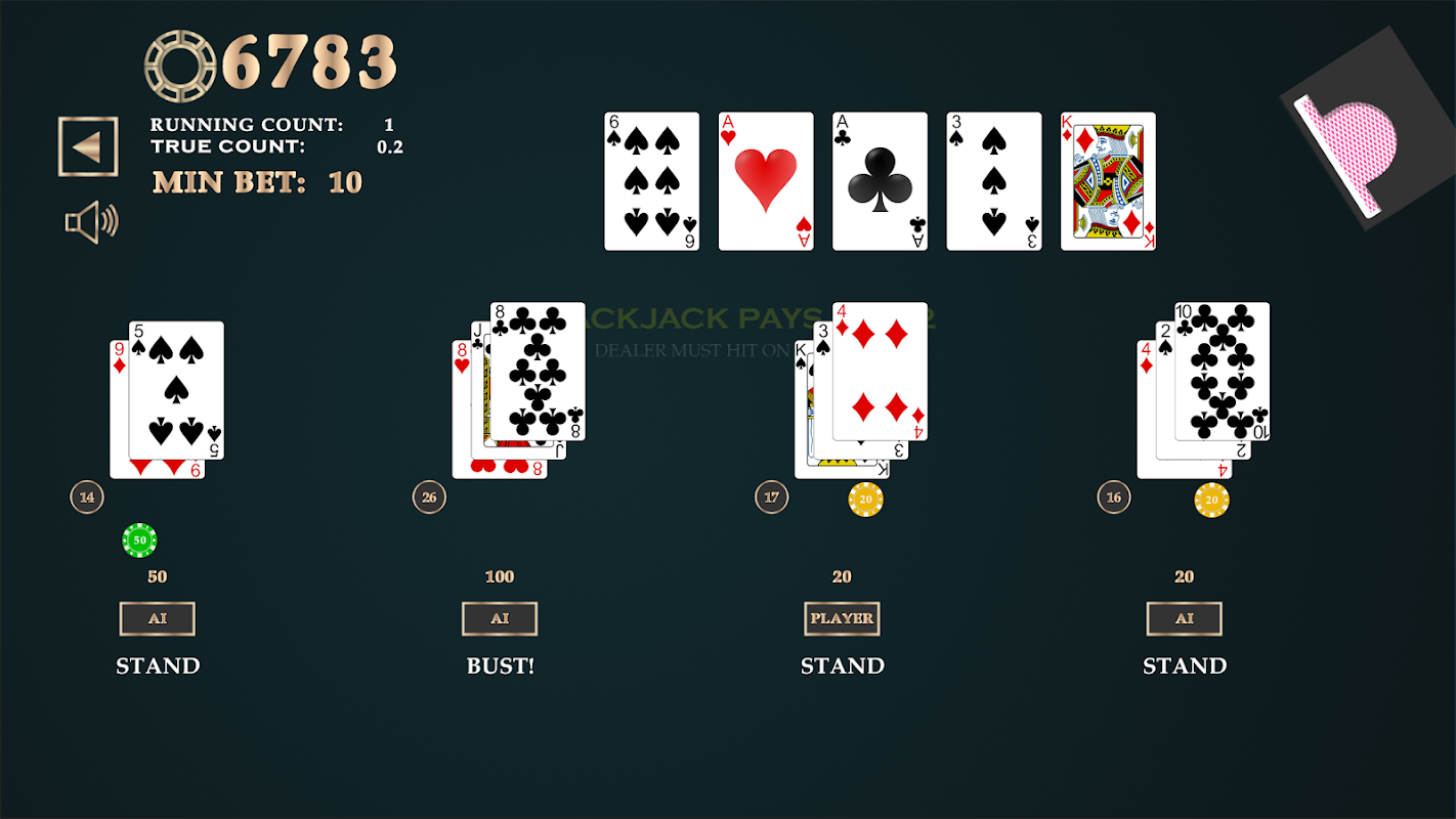 데크 수, 셔플 빈도, 딜러 행동 등 실제 카지노 규칙을 시뮬레이션합니다. 실제 상황에서 카드 카운팅 전략을 연습하는 데 적합합니다.