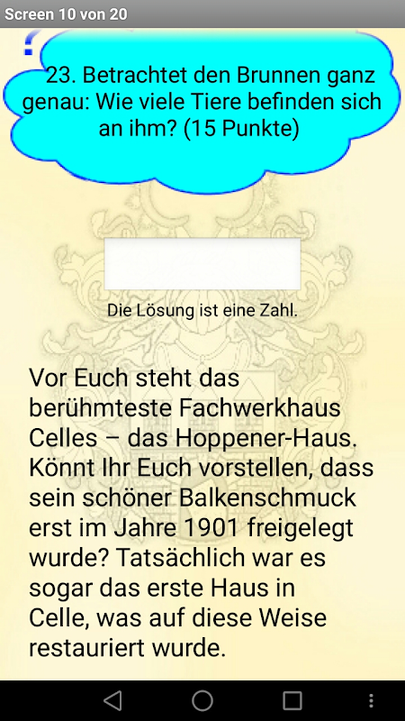 Machen Sie eine Stadtrallye durch die Fachwerkstadt Celle. Fordern Sie z.B. Ihre Kinder heraus und spielen Sie "leichte Fragen" gegen "schwere Fragen". Vergleichen Sie nach jeder Antwort Ihren Punktestand und suchen Sie gemeinsam den nächsten Ort. Oder starten Sie mit Freunden in mehreren Gruppen gegeneinander und versuchen Sie, möglichst viele Punkte zu erreichen.