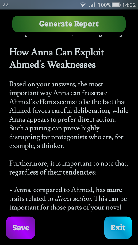 Analyzing key personality traits, Character Nods creates a complex, analytic report of the protagonist and the antagonist of your novel, detecting problem areas and, more importantly, offering suggestions.